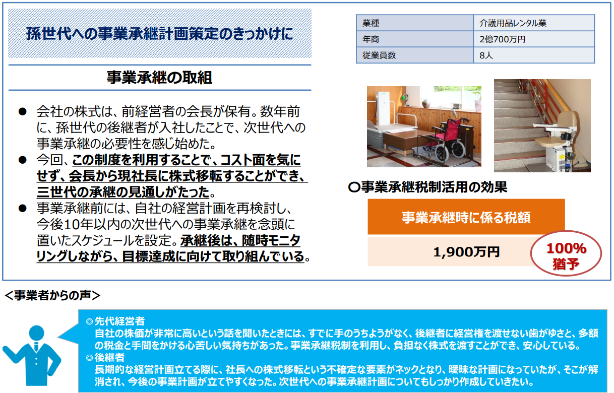 中小企業庁の法人版事業承継税制の活用事例では以下のような具体的な事例を紹介しています。